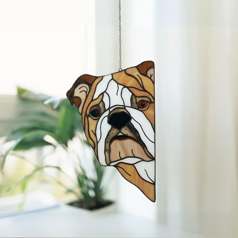Handmade custom stained glass dog suncatchers are personalized pet portraits, perfect for...