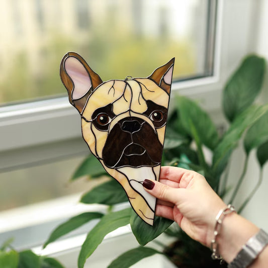 Handmade custom stained glass dog suncatchers are personalized pet portraits, perfect for all dog breeds. Customize colors and add personalized tags for a truly special touch.