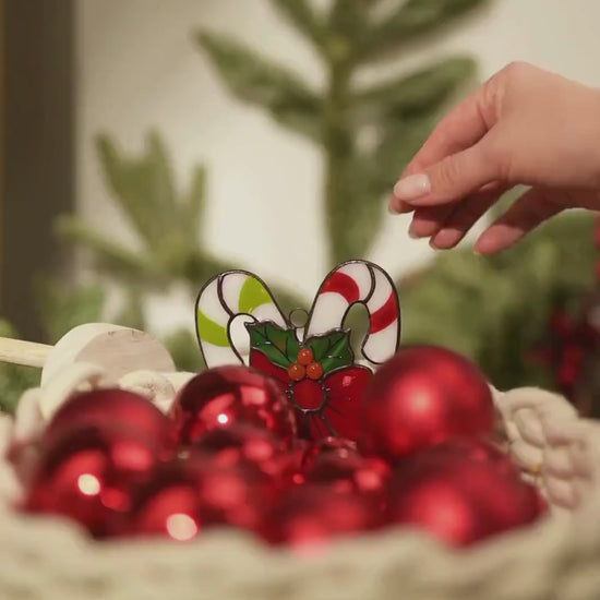 Invite the spirit of Christmas into your home with this Stained Glass Candy Cane Ornament, featuring two crossed candy canes tied together with a festive bow. Symbolizing joy, generosity, and timeless holiday tradition, this piece captures the warmth of seasonal gatherings and the sweet nostalgia of childhood Christmas mornings. When touched by light, it glows like a memory — bright, pure, and full of cheer.