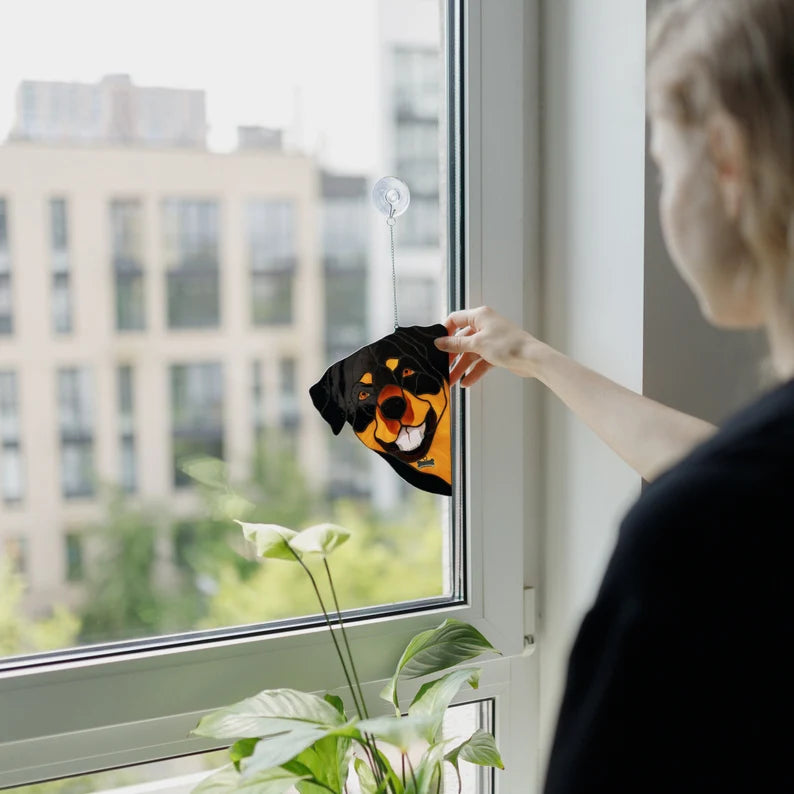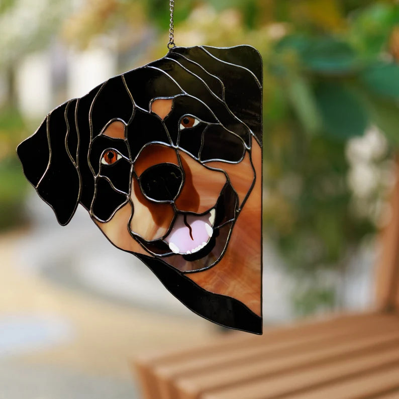 In a serene studio bathed in soft morning light, an artisan's hands danced with precision and passion. Inspired by a loyal Rottweiler's playful antics and unwavering devotion, each stroke of color and delicate line told a tale of love. With careful craftsmanship and heartfelt dedication, a masterpiece emerged from molten glass and shimmering foil – the Rottweiler's Suncatcher. Its vibrant hues captured the Rottweiler's spirit, while its intricate design mirrored the bond between human and canine. A symbol of timeless love and companionship, the suncatcher was born to adorn homes with warmth and joy, a tribute to the magic of furry friendships.