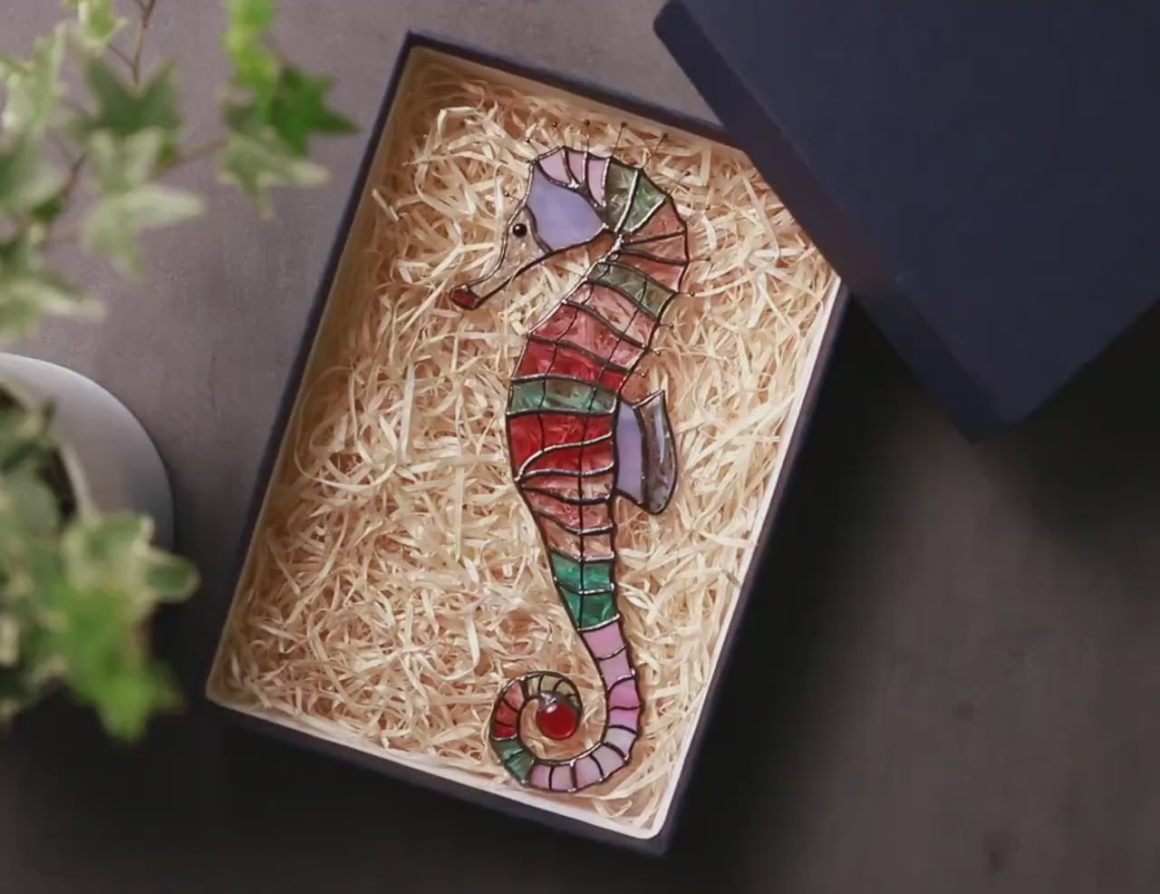 In the tranquility of coastal vacation, we found inspiration in the joyful essence of beach life. The creation of our Stained Glass Seahorse Suncatcher was sparked by the love for family and the blissful memories created by the sea. This unique coastal decor piece embodies the spirit of happiness and relaxation, adding a touch of beachside charm to any home. Imagine the joy of gazing at this bright handmade suncatcher, a reminder of cherished moments and the importance of family in our lives.