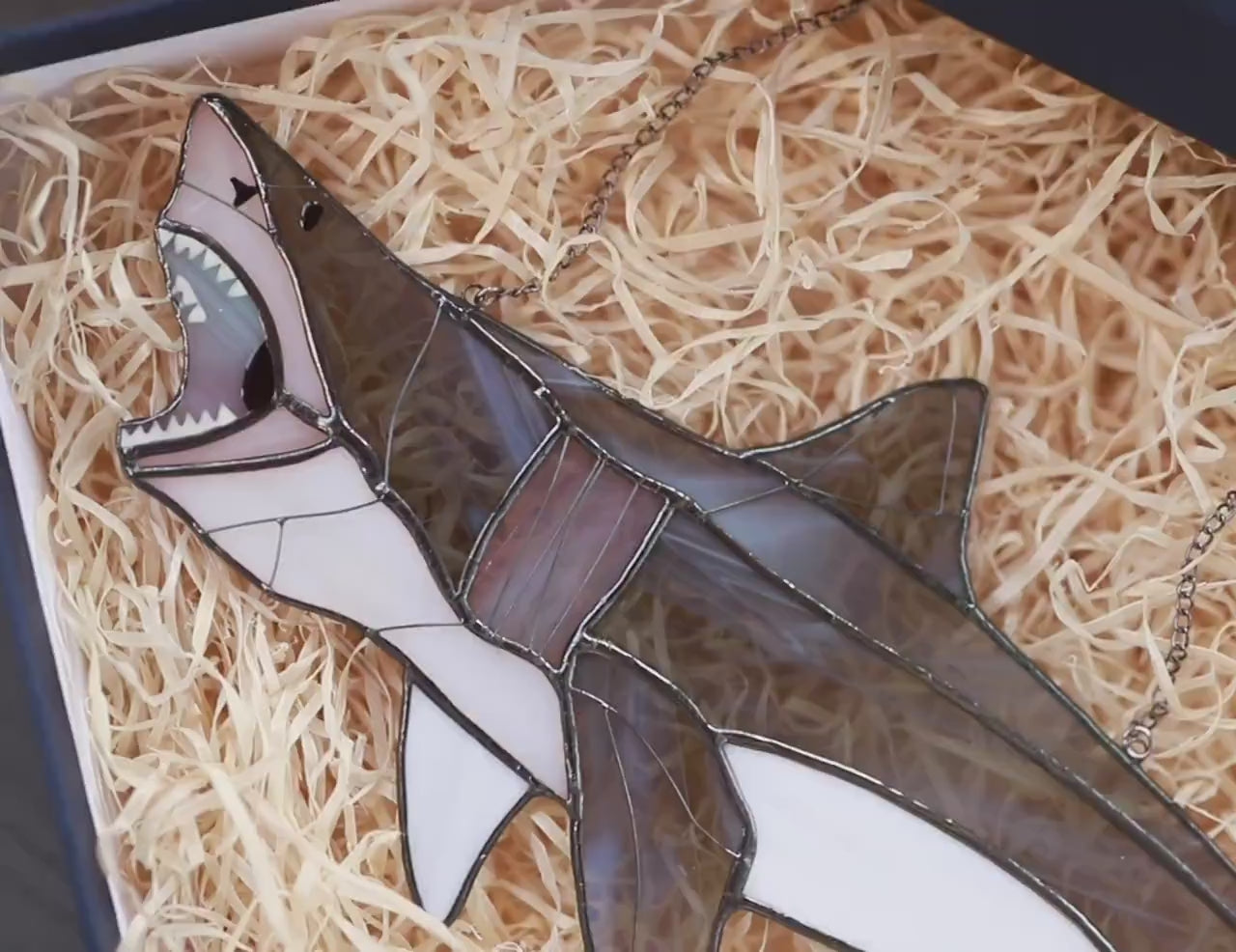 The Stained Glass Shark embodies the allure of the ocean's apex predator, born from a passion for the mesmerizing beauty of sharks. This stunning piece of art celebrates the fierce yet graceful nature of these creatures, captivating all who behold it. With intricate detailing and vibrant colors, our shark-stained glass captures the essence of these magnificent beasts, inviting you to admire their majesty up close. It's a symbol of our deep-seated fascination with marine life and a tribute to the breathtaking wonders of the underwater world.