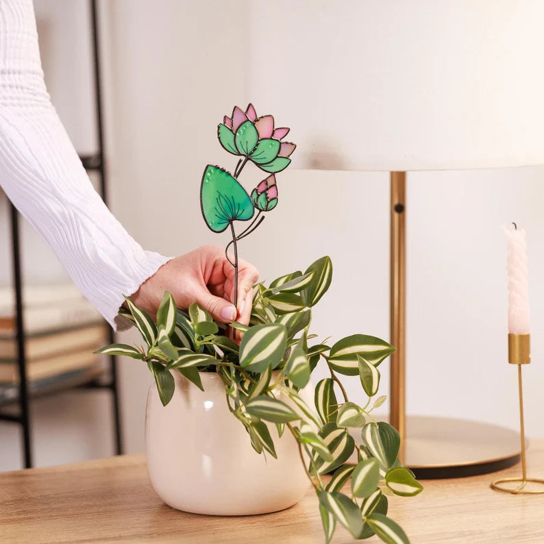 Handmade Stained Glass Water Lily Sunctcher Plant Stake July Birth Flower Gift for Mom